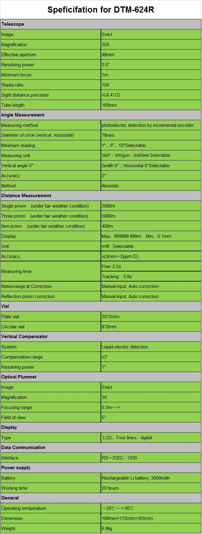 | Single prism: | 3000m; | Communication: | USB/RS-232C,; |