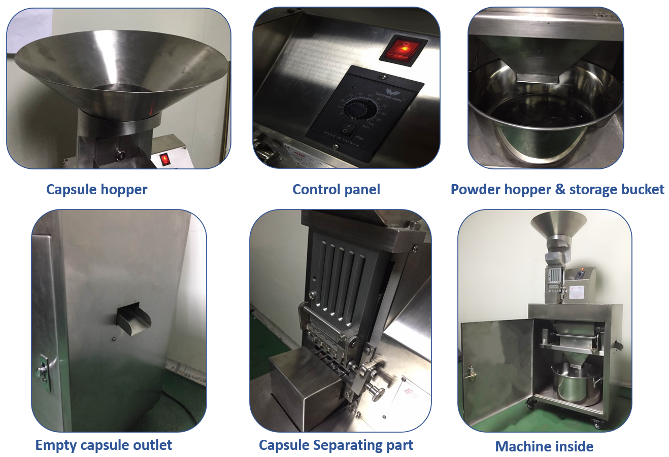 5. This machine can separate the capsules, and then pass through the internal sieve to screen the powder and empty capsules.