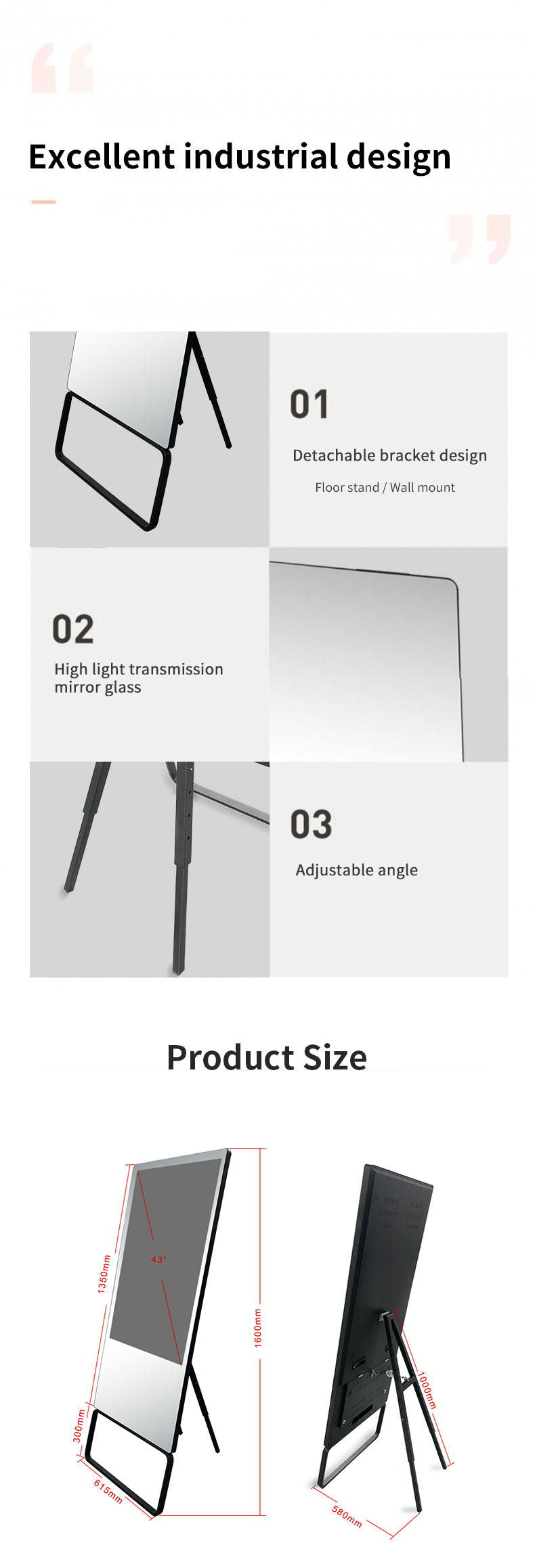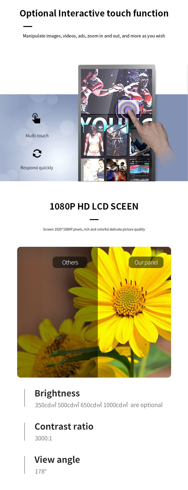 | payment terms: | L/C, Western Union, T/T, Paypal | Panel type: | 43" LCD FHD IPS full viewing angle screen, LED backlight |