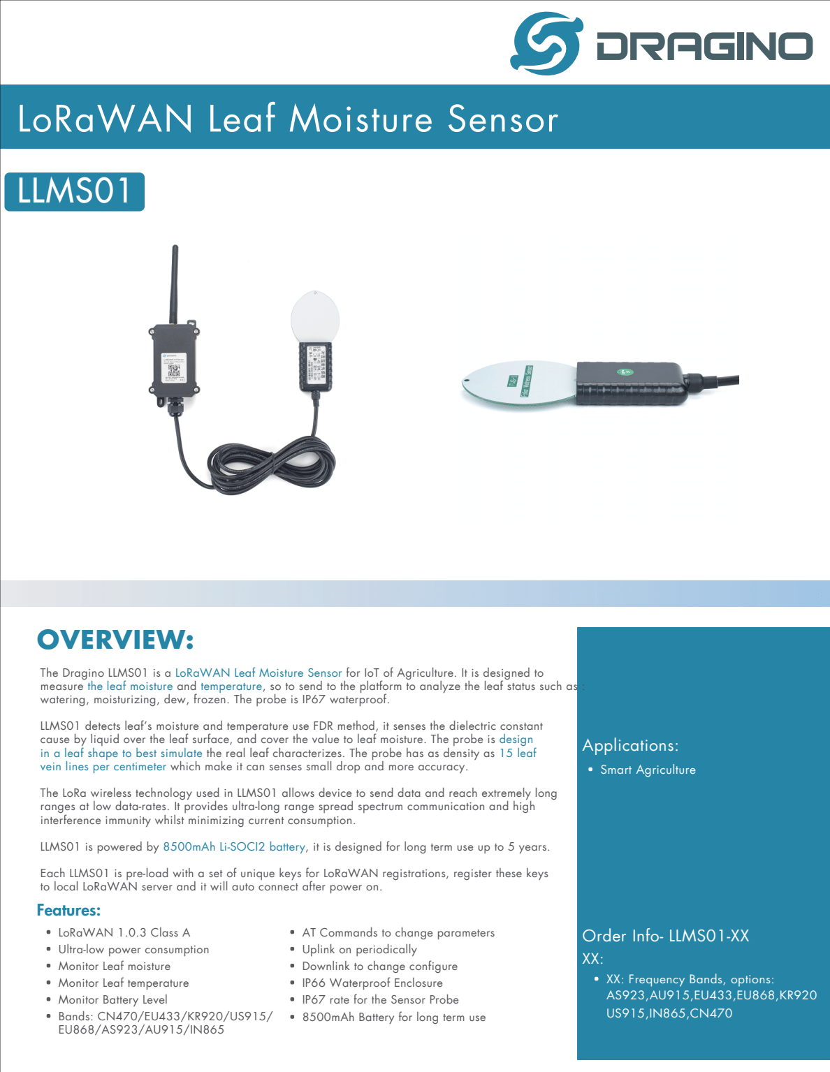 Dragino LLMS01 is a LoRaWAN Leaf Moisture Sensor for Agricultural IoT. It is designed to measure the humidity and temperature of the leaves so that it can be sent to the platform to analyze the state of the leaves, such as: watering, moisturizing, dew, freezing. The probe has an IP67 waterproof rating.