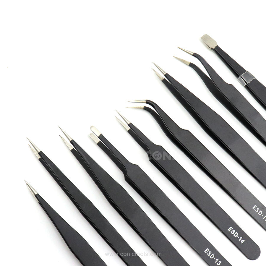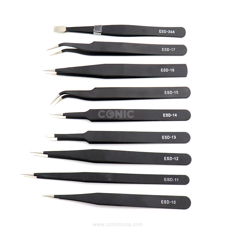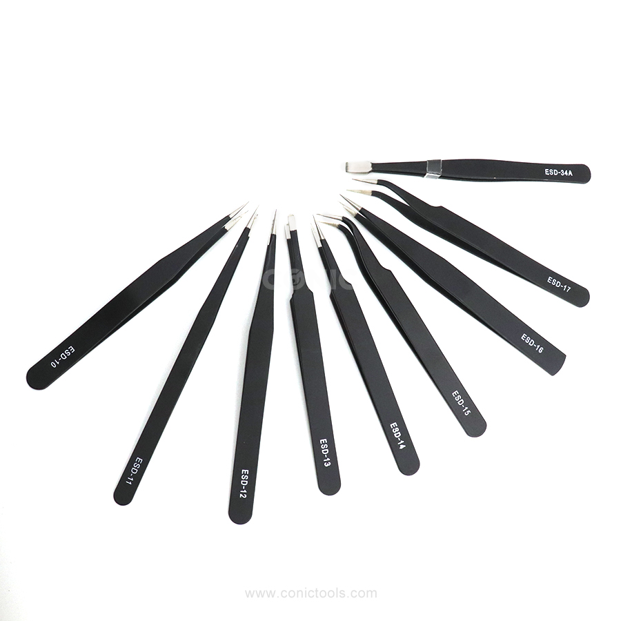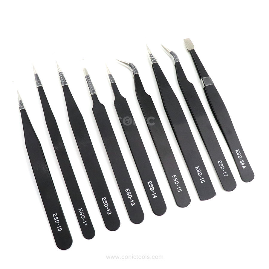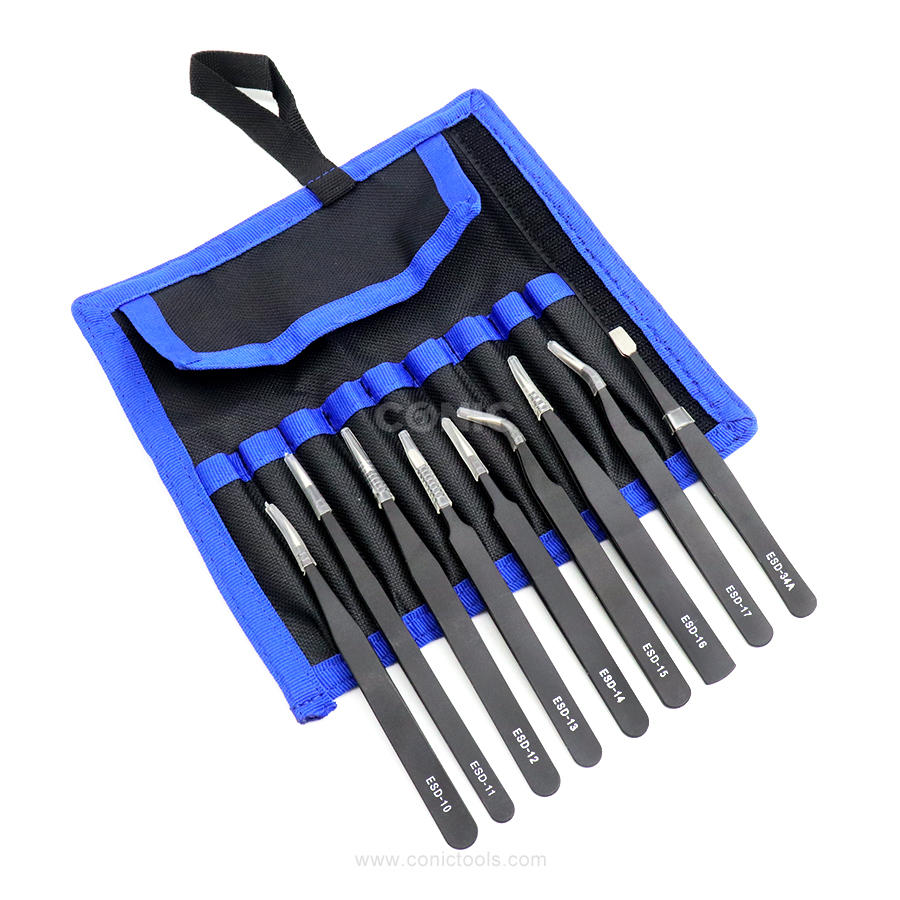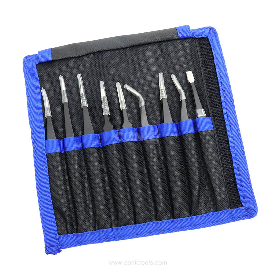 Stainless Steel Tweezers Pointed Elbow ESD Precision Tweezers 9pc Canvas Bag Tweezers Set | ||