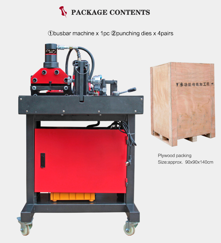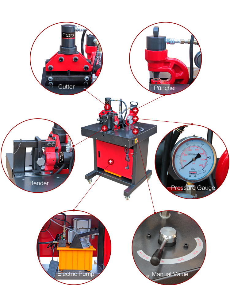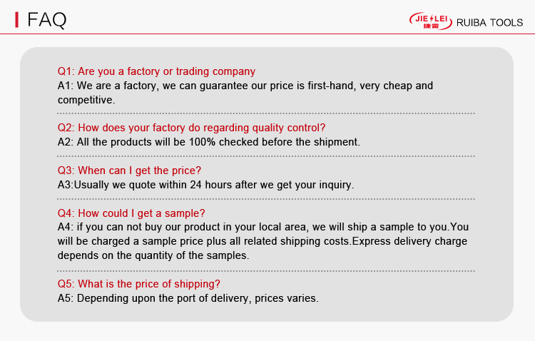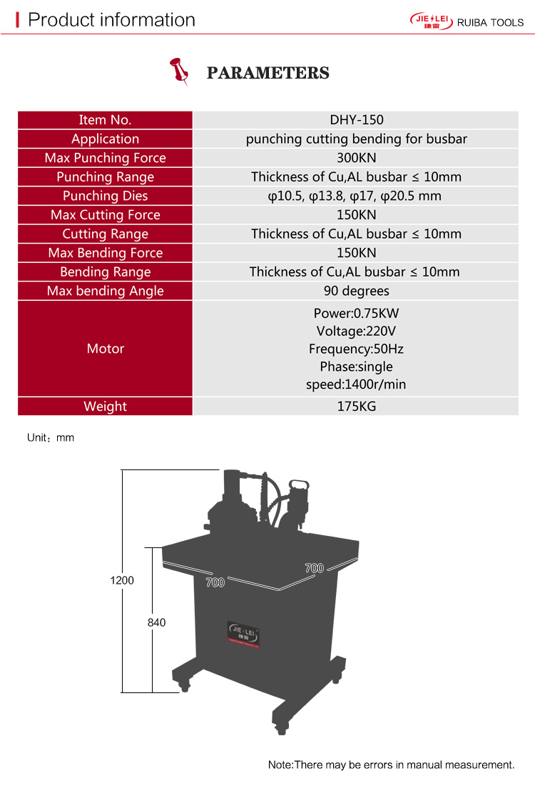Product model DHY-150 Suitable for busbar punching and bending Maximum punching force 300KN Punching range Copper and aluminum busbar thickness ≤ 10mm Punching die φ10.5, φ13.8, φ17, φ20.5 mm Maximum punching force 150KN Shearing range Thickness of copper and aluminum busbars ≤ 10mm Maximum bending force 150KN Bending range Copper and aluminum busbar thickness ≤ 10mm Maximum bending angle 90 degrees Motor power: 0.75KW Voltage: 220V Frequency: 50Hz Phase: Single speed: 1400r/min Weight 175KG application drive single-acting hydraulic cylinder. Note: "The motor can be customized to suit the power supply of different countries." Taizhou Ruiba Tools Co., Ltd. is a tool manufacturer, established in 2013, located in Yungang Industrial Zone, Yuhuan County, Zhejiang Province, China. We specialize in manufacturing, developing and selling hydraulic tools, battery powered tools, mechanical pliers such as hydraulic crimping tools, cable cutters, rebar cutters, busbar processing tools, hydraulic jacks, hydraulic pullers, hydraulic pumps for power construction, construction work, Rescue work. After years of hard work, we have established our own brand "JIELEI", which has become a household name in China. We have established a production team with more than 10 years of experience, with various modern production equipment such as CNC machine tools and CNC machining centers. In order to keep up with the needs of our customers, we do this by adopting new technologies, using high-quality materials, modifying designs, and even buying new advanced machines, our goal is to provide qualified tools based on competitive prices. We sincerely welcome friends and customers to visit our factory and have face-to-face communication, and we hope to establish a long-term and mutually beneficial business relationship with you in the near future. Q1: Are you a factory or a trading company A1: We are a factory, we can guarantee our price is first-hand, very cheap and competitive. Q2: How does your factory do regarding quality control? A2: All products will be 100% inspected before shipping. Q3: When can I get the price? A3: Usually we quote within 24 hours after we get your inquiry. Q4: How can I get a sample? A4: If you cannot buy our products locally, we will ship samples to you. You will pay the sample price plus all associated shipping charges. The courier cost depends on the quantity of samples. Q5: How much is the shipping cost? A5: Depending on the port of delivery, the price is different.