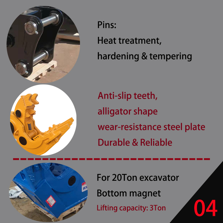 magnet optional: Equipped at the bottom24V electromagnet, the steel bar can be cut and used for absorption. Directly connected to the excavator battery, no need to install a generator, the installation is simple and more effective. | ||||||||