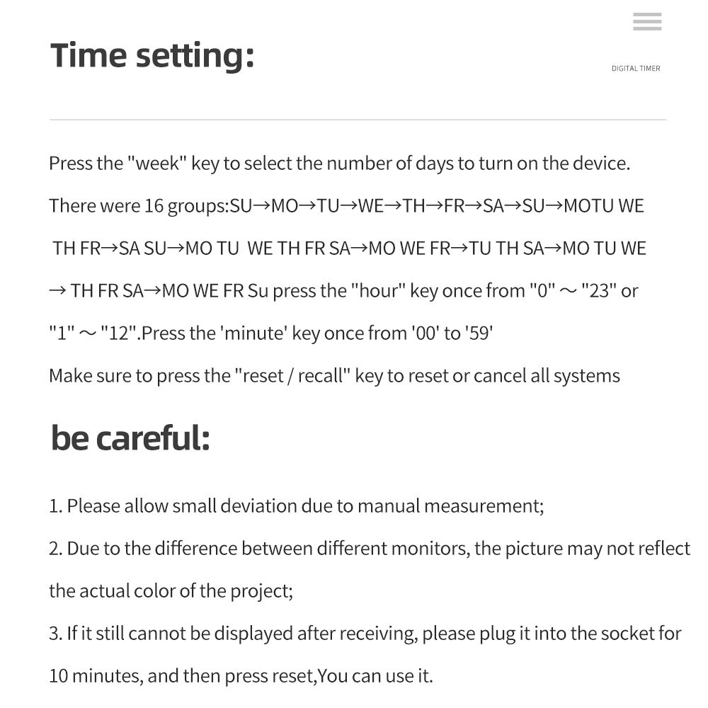 - It has a built-in battery to operate the clock and help you set the timer. Before operation, if the device is out of power and nothing is displayed on the display, please plug the device into the socket for about 5~10 minutes to charge.