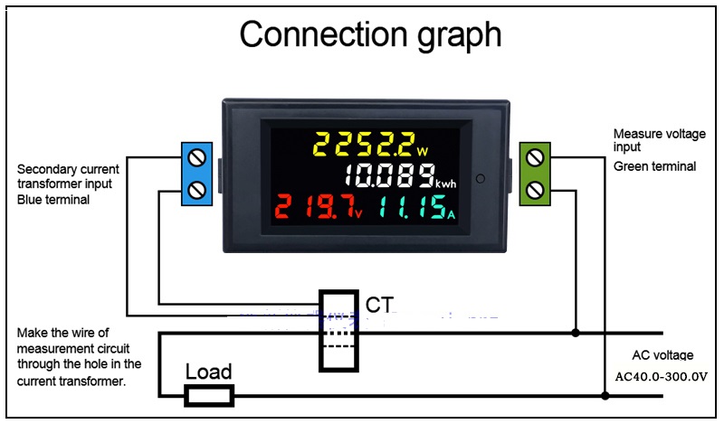 1. Incorrect connection of voltage input (green terminal) and secondary current transformer (blue terminal) will damage the instrument.