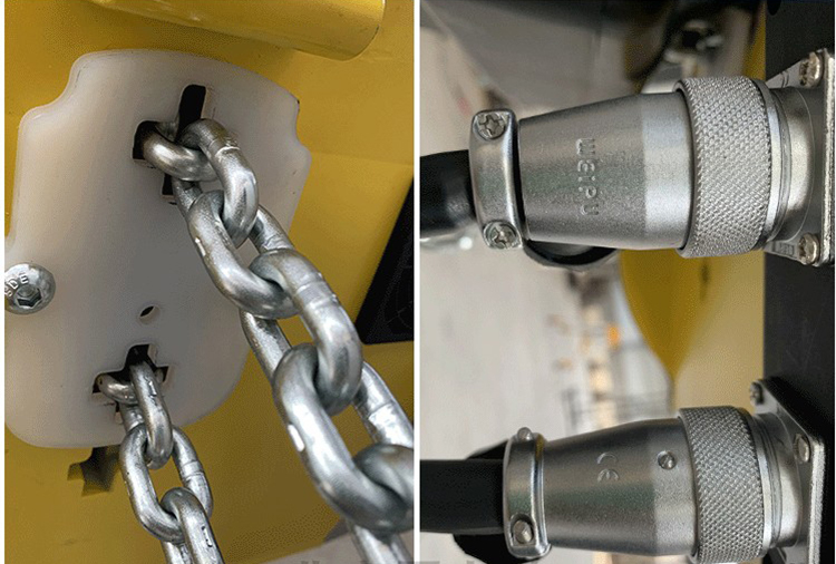 Motor: IntegratedThree-phase two-speedAsynchronous motor hoist housing:All aluminum alloy die casting, CNC body processing gearbox: grinding and processing hard-toothed helical gear, gearbox oil stickControl board: Board control, DC5V control voltage, optional DC24V control with phase sequence protection Handset:GG handle imported from Italychain: Import chainSprocket:Alloy steel sprocketLimit switch: CHERRY German cherry waterproof travel switchPlug: Weipu aviation plug is used for power supply, gold-plated crystal head is used for control, and alloy protection
