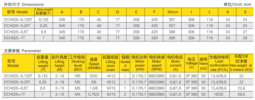 Every DCH electric chain hoist is equipped with two speeds. The speed ratio of DCH0125, DCH025, DCH050, and DCH100 is 1:4, and the speed of DCH0125 can reach 20M/min.
