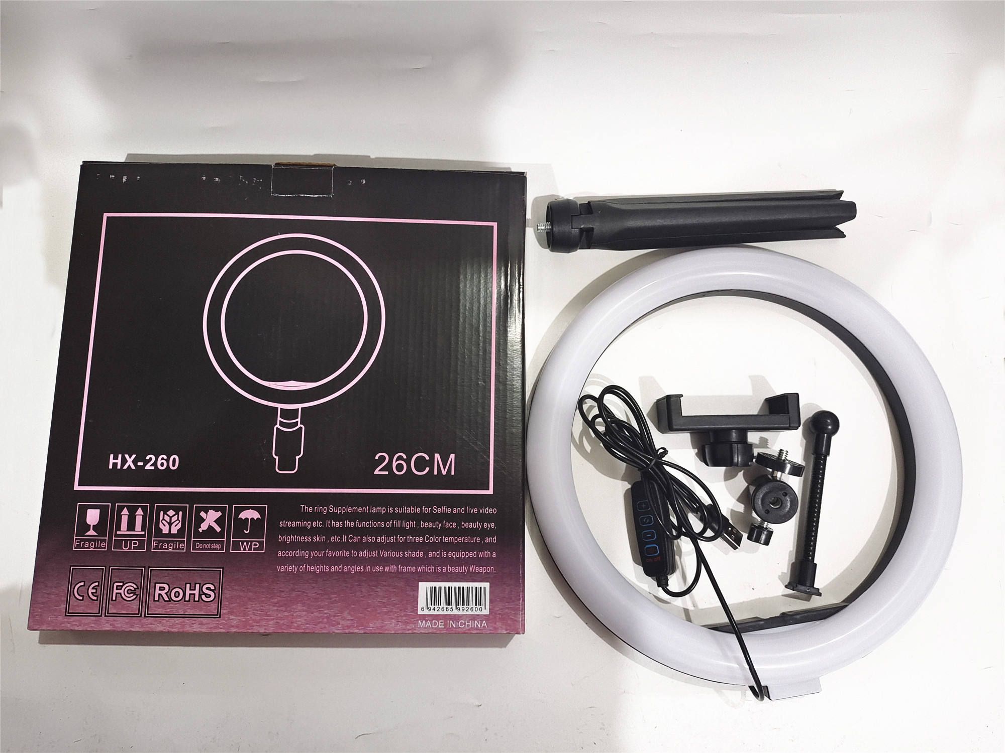 | Single pack size: | 26X25X72 cm | Name: | 10 inch ring light |