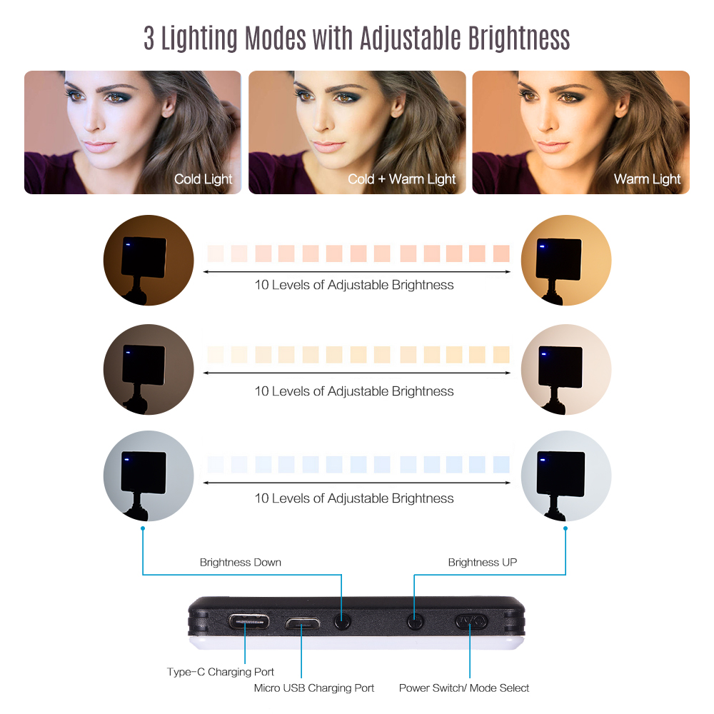 Adjustable Brightness:3 lighting modes (cold light, warm light, cool+warm light), each lighting mode has 10 levels of brightness adjustable to meet all your needs in different situations.