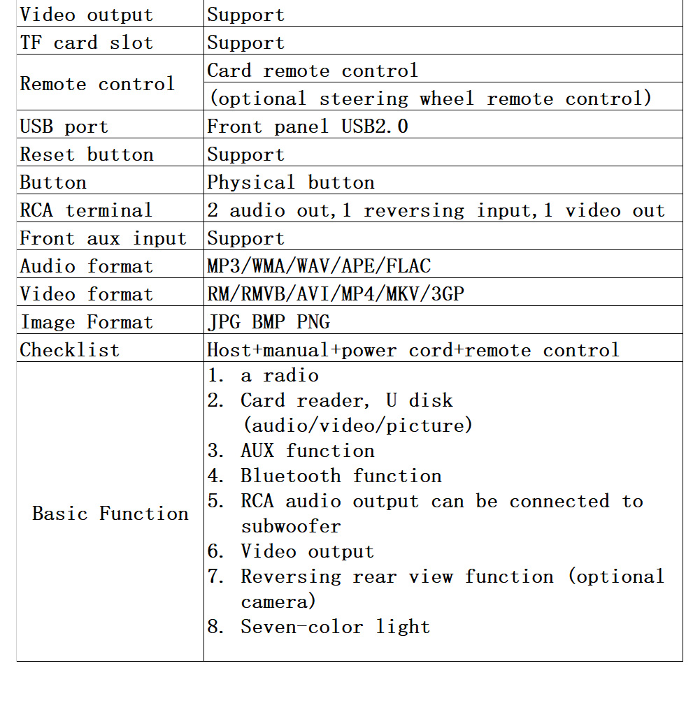 | Video format: | RM/RMVB/MP4/FLV/UKV/3GP/AVI/ASF/MP2 | Steering wheel controls | support |