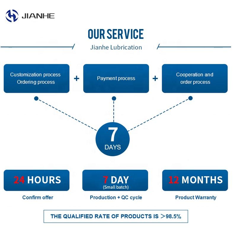 Jiaxing Jianhe Machinery Co., Ltd. is mainly engaged in the development, design and manufacture of centralized lubrication systems, automatic lubrication systems, grease lubrication systems, oil lubrication systems, and oil-air lubrication systems. The main products are automatic lubrication pumps, electric lubrication pumps, pneumatic lubrication pumps, manual lubrication pumps, grease pumps, progressive lubrication systems, quantitative lubrication systems, resistance lubrication systems, progressive distributors, quantitative distributors, pipe connectors, Metering units and high-pressure nylon products are widely used in robots, cutting machine tools, forging machine tools, plastic machinery, CNC machine tools, engineering machinery, vehicles, metallurgical machinery, textile machinery, printing machinery, woodworking machinery, chemical machinery, mining machinery and other industrial machinery