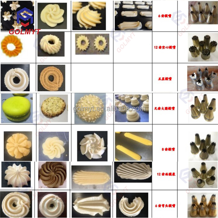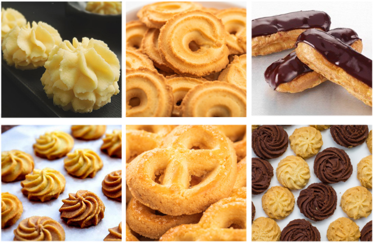 1. This machine adopts a humanized touch operation panel, which can memorize about 50 product models. There are 3 types of products in total, and each product can memorize 10 types. 2. The filling trolley adopts silicone round gears, and the baking wheel can move up and down to reduce wire drawing and produce no air bubbles. 3. Fixed filling and mobile filling can be used to produce diversified products. 4. You can choose single operation or joint operation to cooperate with the production line. After the grouting is completed, the pot can be placed continuously in one direction. It can also be operated by one person, returning from the opposite direction. 5. Filling according to different baking utensils and containers. Fill height, spacing and quantity can be customized. 6. You can choose the die opening to make biscuits of different specifications. Die size can also be customized. Filling methods include point row and continuous conveyor filling paste. 7. Made of 304 stainless steel, clean and safe, easy to maintain. The gear of the extruder for the filling part adopts mold non-stick treatment. 8. This machine is specially used to produce a variety of biscuits: chrysanthemum type/stripe type/spiral type with holes in the middle.