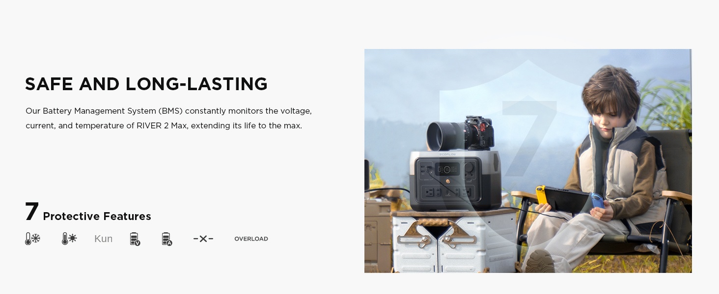 Our Battery Management System (BMS) continuously monitors the RIVER 2 Max's voltage, current and temperature to maximize its lifespan.