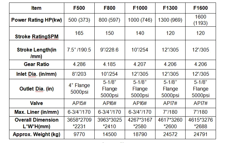 F Series Mud Pump Parameters: