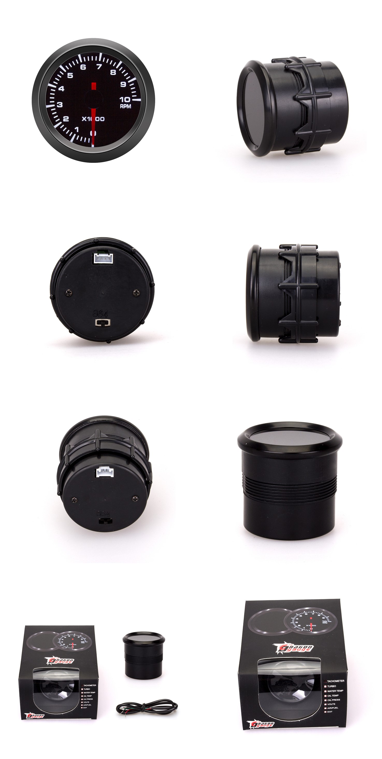 Specification:Runs with 4, 6 or 8 cylinder engine Diameter: 52mm/2" Unit: RPM Measuring range: 0~10×1000rpm Lighting: white light Power supply: 12 V Housing: black Outer ring: black ring Material: plastic Net weight: about 250g Packaging Size: 16.5×12.5×7.5