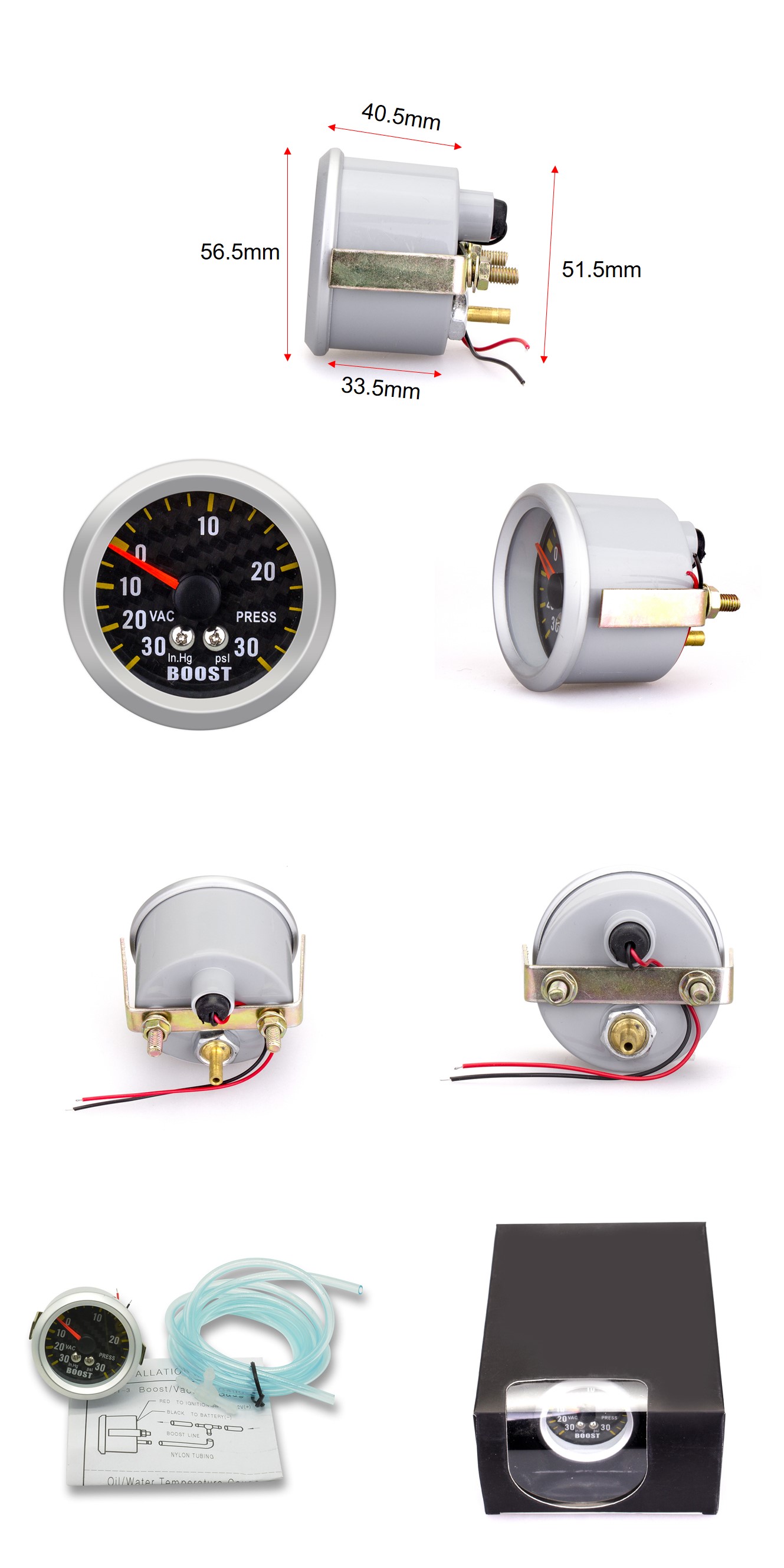 Specification:Diameter: 52 mm/2 inches Unit: Pounds per square inch Measuring range: -30~30psi Lighting: white Power supply: 12V Shell: gray Outer ring: Aluminum sub-aperture Base Color: Carbon Fiber material: plastic Net weight: about 200g | The package includes:1*turbocharger 1*PVC hose 1*T type tee 1*User Installation Manual |