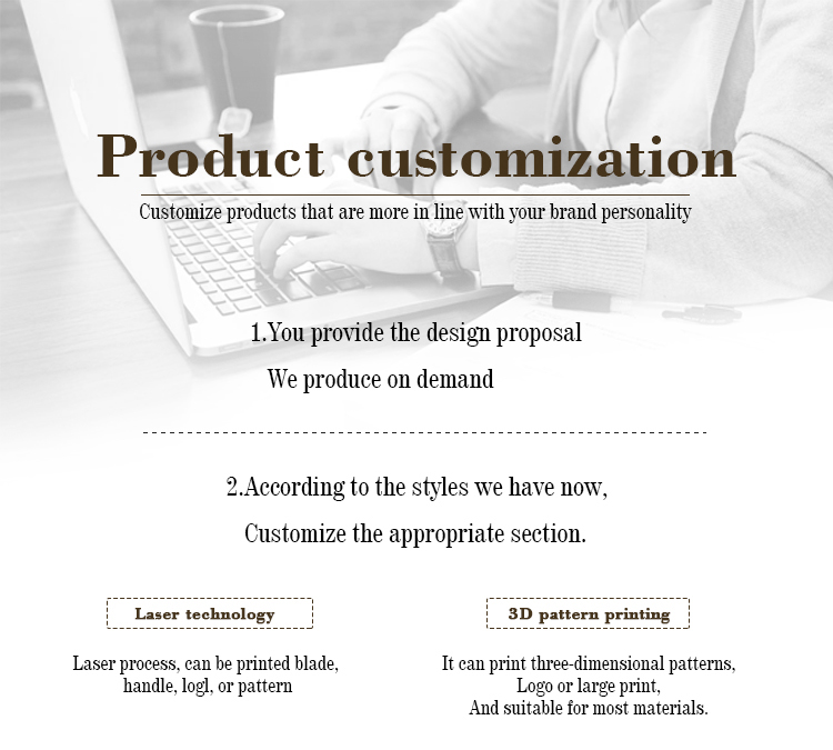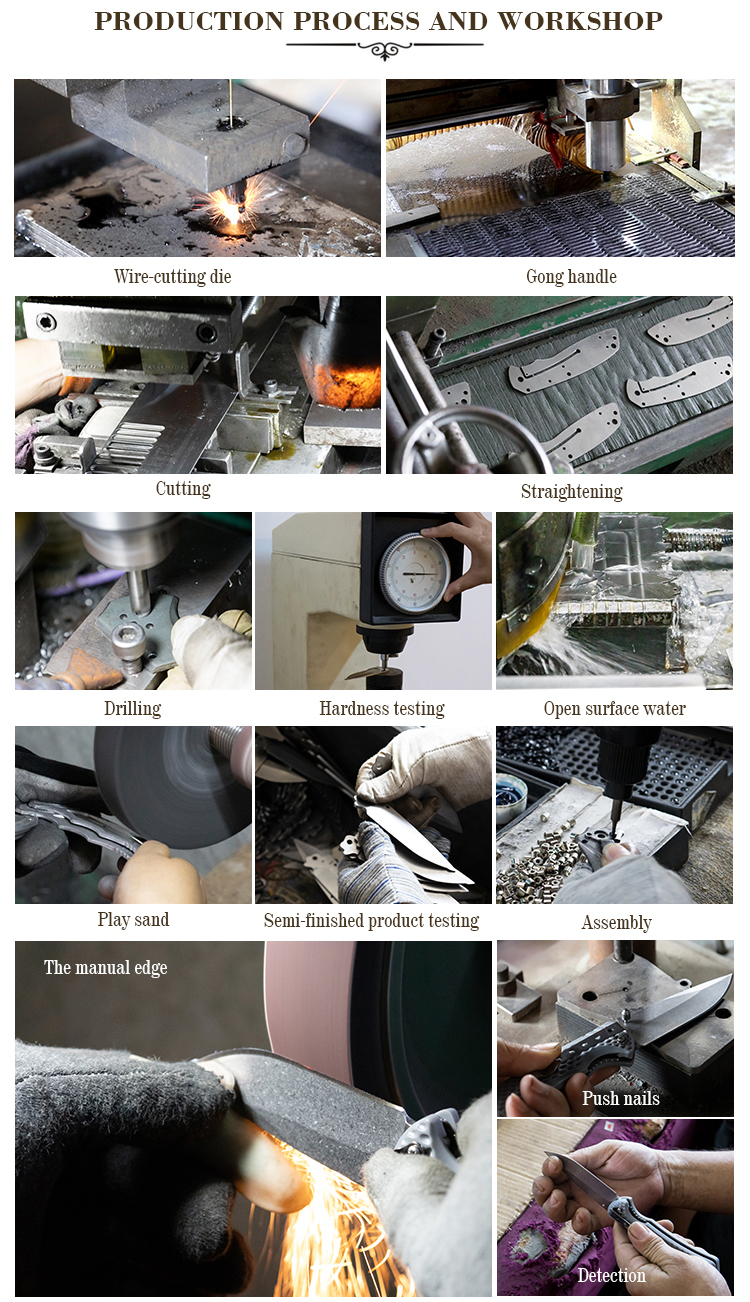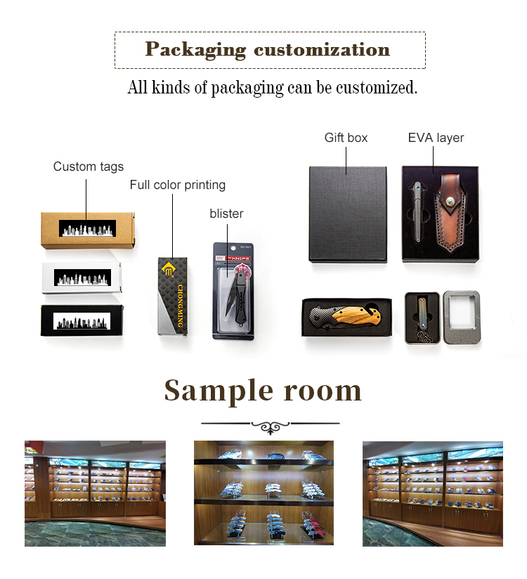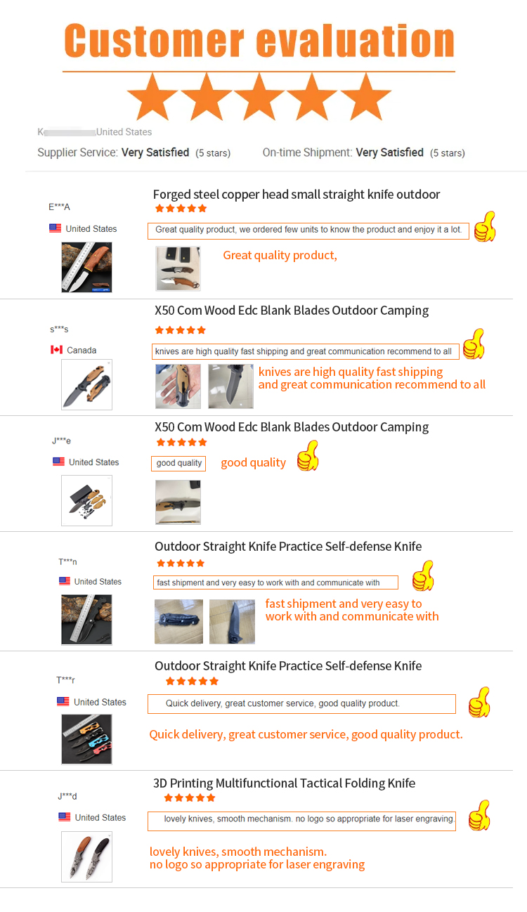 Q1: Can we order small quantity?Answer: Yes. Some of our knives MOQ is 2pcs.Q2: Can you do the design for us?Answer: Yes. We have a professional team to customize orders for you. You just need to tell us your ideas, we will help you make the knives you need.Q3. Can I customize the product?Answer: Absolutely. We can customize knives according to your design and make your own brand logo. We can also pack the products according to your requirements.Q4: What is the lead time for mass production?A: It usually takes 30 days according to the order quantity.