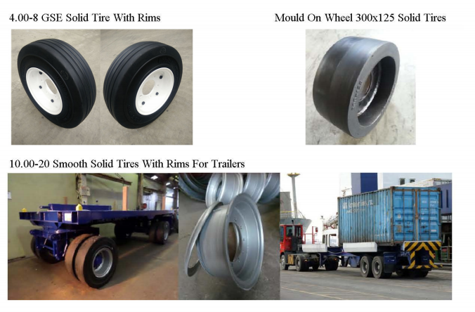 We have successfully designed and produced solid tires in various sizes for trailers and ground support equipment (GSE) in seaports, airports, logistics centers etc. Our solid tires have been widely used in airport luggage trolleys, airport trailers and other ground support equipment luggage carts, mail carts, port heavy trailers, container and pallet carts.