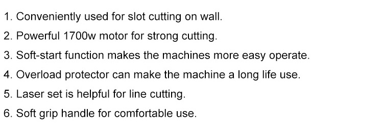 feature | 1. Convenient for wall slotting 2. Soft start function makes machine operation more convenient (optional). 3. Overload protection device makes the machine have a longer service life (optional). 4. Laser device facilitates wire cutting (optional) |