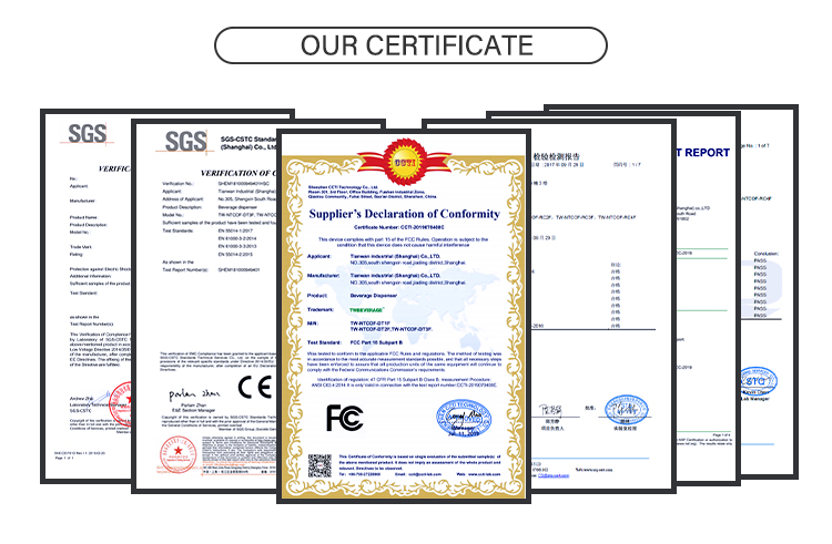 Shanghai Tianwan Catering Equipment Co., Ltd. Tianwan Industry (Shanghai) Co., Ltd. was established in 2007 and officially changed its name to Tianwan Industry (Shanghai) Co., Ltd. In 2016, Tianwan has devoted itself to the R&D and manufacturing of food and beverage equipment for many years. Tianwan can not only provide advanced high-quality equipment, but also provide overall solutions to meet the needs of corporate customers such as global beverage brands, coffee chains, tea chains, and restaurant chains. After years of hard work, we have successfully served many world-renowned brands and established in-depth cooperation. Tianwan has a wide range of product lines to meet customers' needs for carbonated beverages, non-carbonated beverages machines, soda machines, juice machines, beer machines, nitro cold brew coffee machines, cocktail machines, milk tea machines, glass freezers, etc. The equipment is suitable for use in catering industry, chain industry, entertainment industry, hotel, supermarket and other places, and occupies a significant share in the international market.TWB drinks® is a registered trademark of Tianwan. Tianwan has obtained ISO-9001 quality management system certification, US NSF certification, EU CE safety certification, Japan SK, China GB contract food safety certification, etc.Our mission: To provide global customers with safe, healthy and efficient beverage machines, as well as commercial, high-end, fast and stable overall solutions.