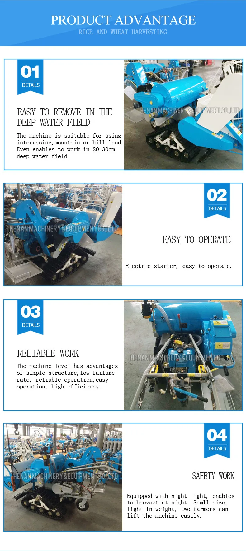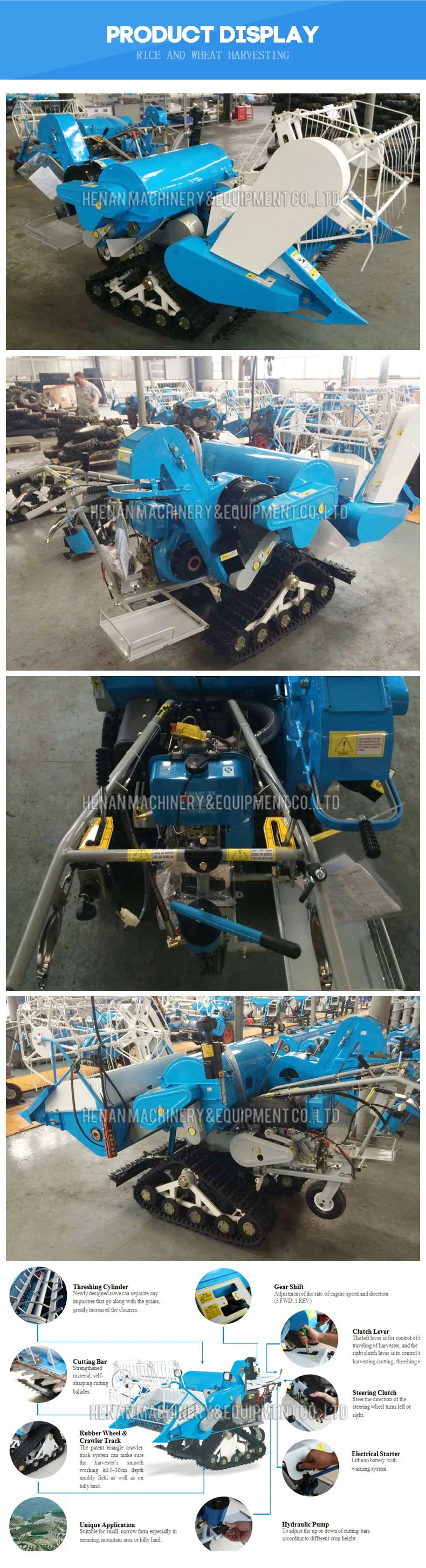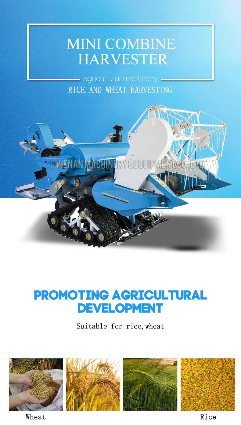 Mini combined harvester is a kind of multifunctional combine harvester, which is mainly used to harvest rice grain and wheat grain. It enables to reap, thresh paddy rice at the same time; it can work in paddy field with 25cm in depth. It's available for using in the mountainous areas, hills, plain, paddy field, and terrace work.It is easy to operate and light in weight, two men can lift. Reducing the burden of the peasants, and improve their working efficiency, thus greatly improve their living standard. Connected structure: easy to disassembly and assembly, only by four screws it can be divided into harvesting assembly, diesel engine and chassis for manual carrying.