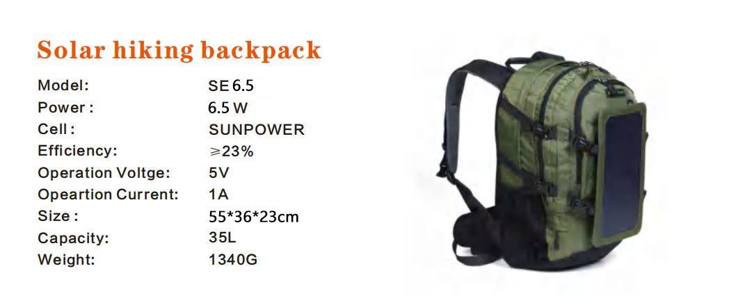 | product name: | Waterproof Solar Panel Power Backpack | Solar panels: | 6.5W SUNPOWER high efficiency |