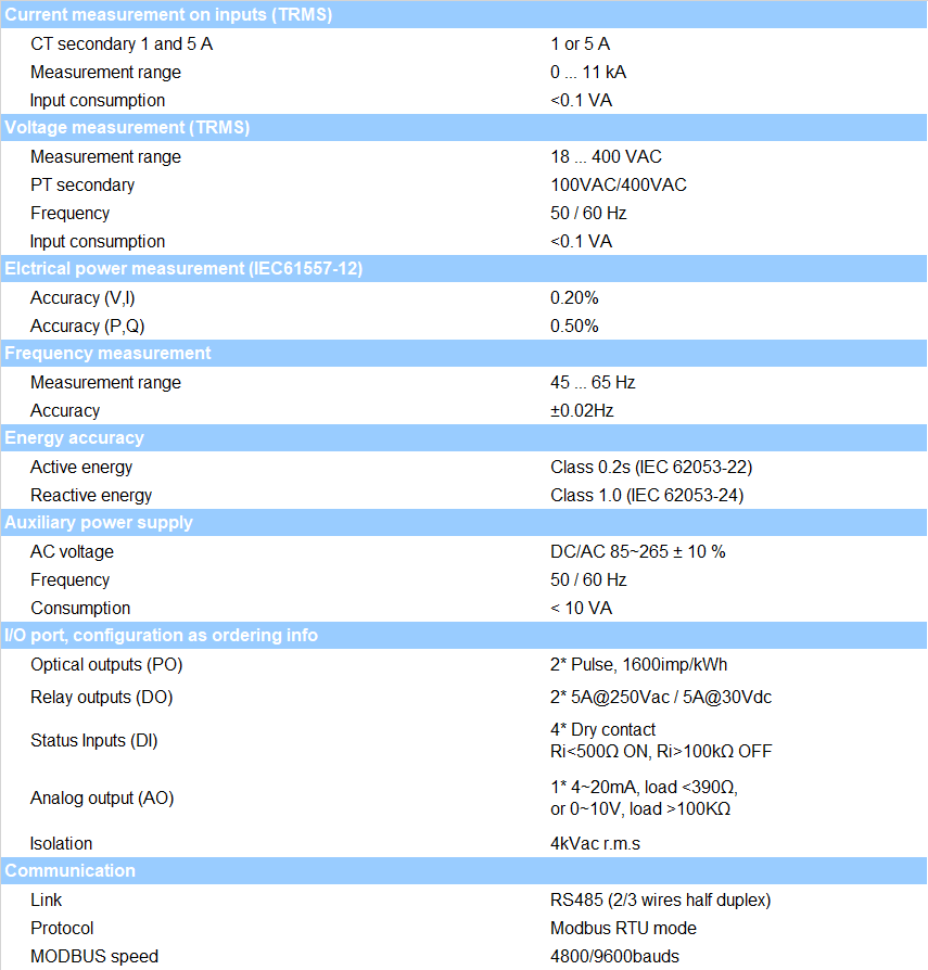 energy (active/reactive), power factor Multiple Tariff Rates Current harmonics 2~63 times, Voltage harmonics 2~63 times, Voltage and current THD%, |