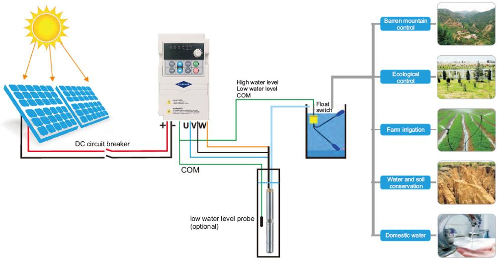 The CV990 series solar water pump inverter is specially designed and manufactured by Canroon for this system. It uses the electricity generated by the solar panel to power the water pump and deliver the groundwater or water from the river to farmland irrigation, desert greening, garden fountain and other applications.
