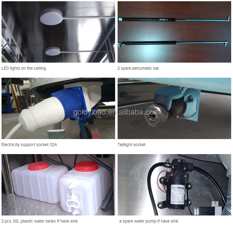Internal equipment:Heating and cooling faucets, daylight, two sinks, two water tanks, 12V mini water pump, two large countertops,