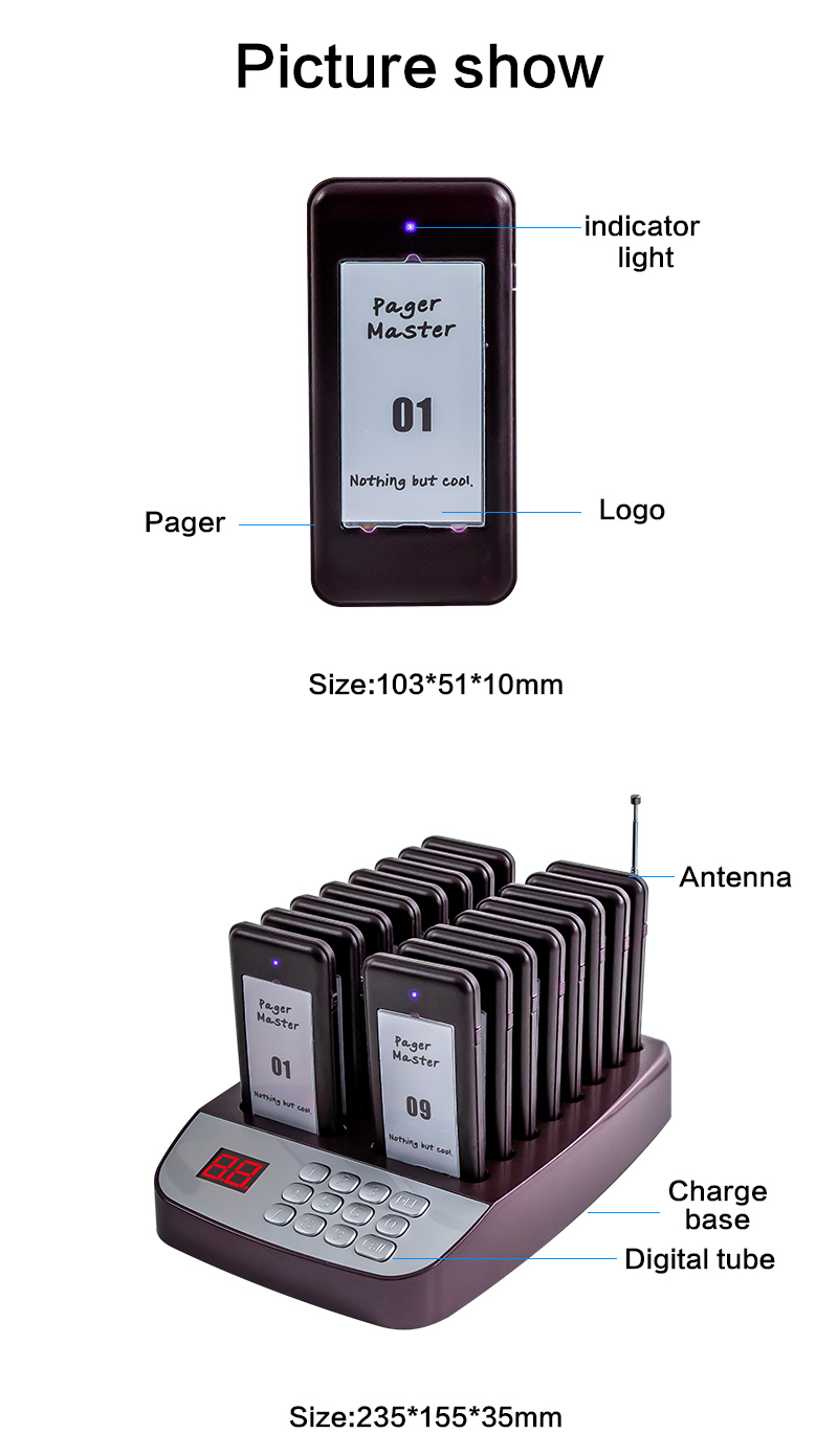 | pager battery | Built-in 3.7V 200mAh rechargeable lithium battery |