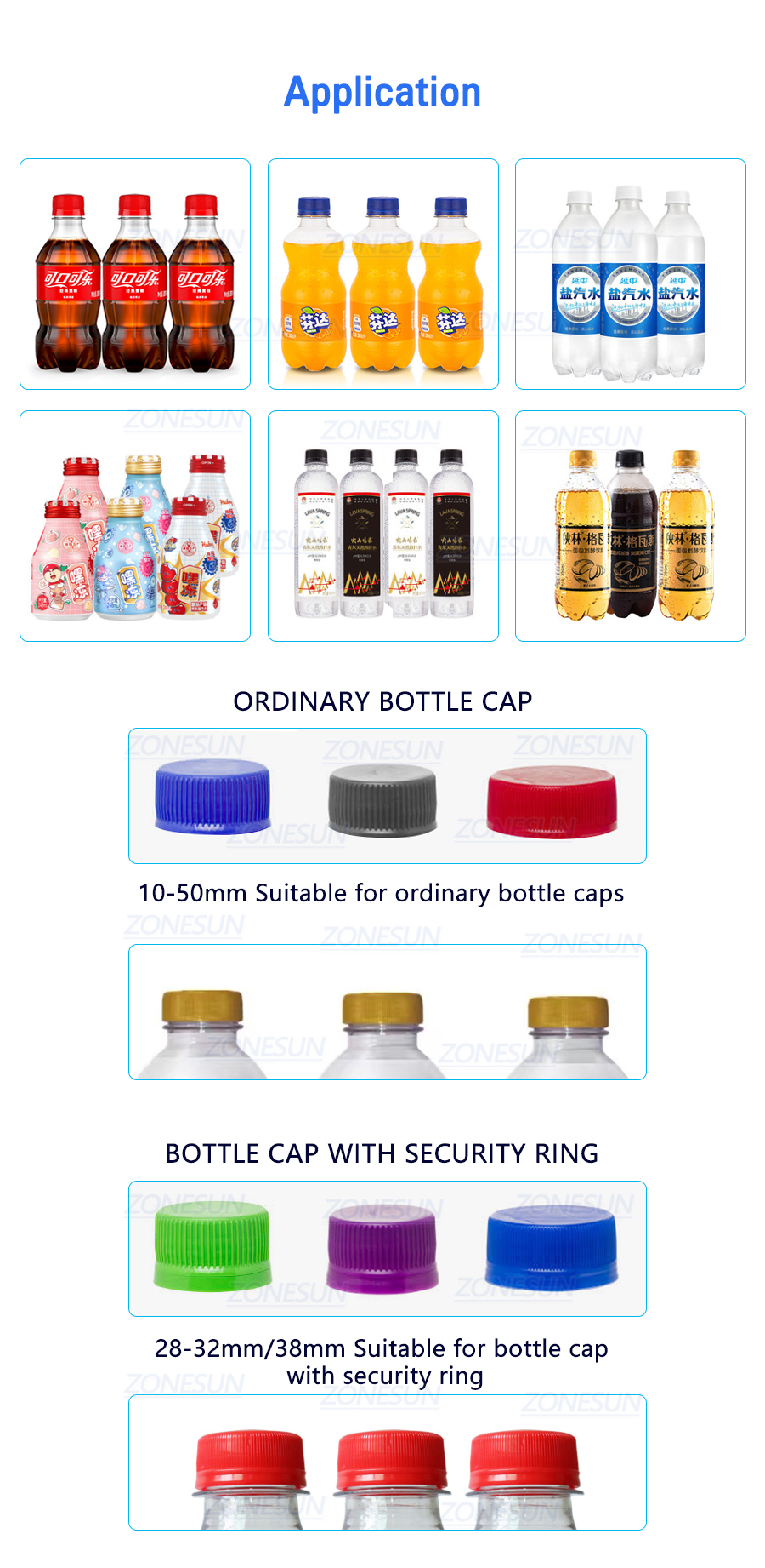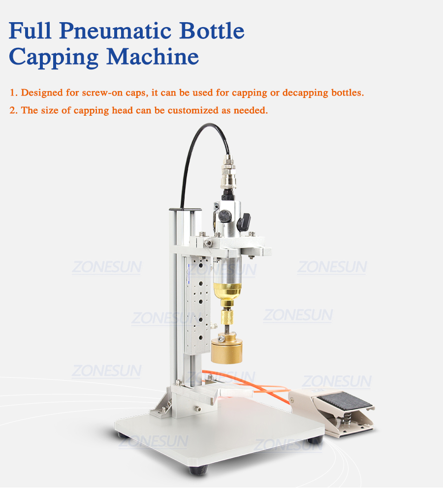 This pneumatic capping machine is used to tighten the bottle caps of bottles with or without safety rings, and the capping chuck can be customized according to the shape of the bottle cap, which expands the application range.