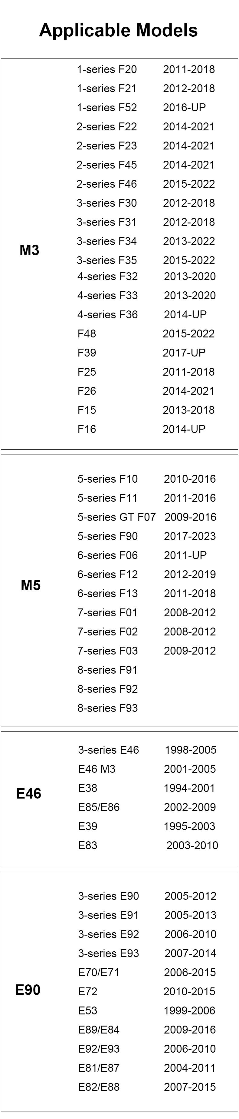 | Model: | 4 coupe (F32, F82), 5 (F10), 325 series, 3 series (E46), 525i, 3 (f30, F35, F80), 5 (E60), 3 series (E90), 3 (E90) , 428i, Series 3 (F30), Series 7 (F01, F02, F03, F04), Series 2 (F22), Series 3 (E92), Series 3 (E46), Series 135 | Year: | 2009-2011,2004-2011,2014-,2008-,2013-,2000-2006,2006-2010,2009-2016,2008-2013,1984-2006,2011-,1998-2005,2001-2010,2014- 2016,2011-2016,2008-2015,2004-2008 |