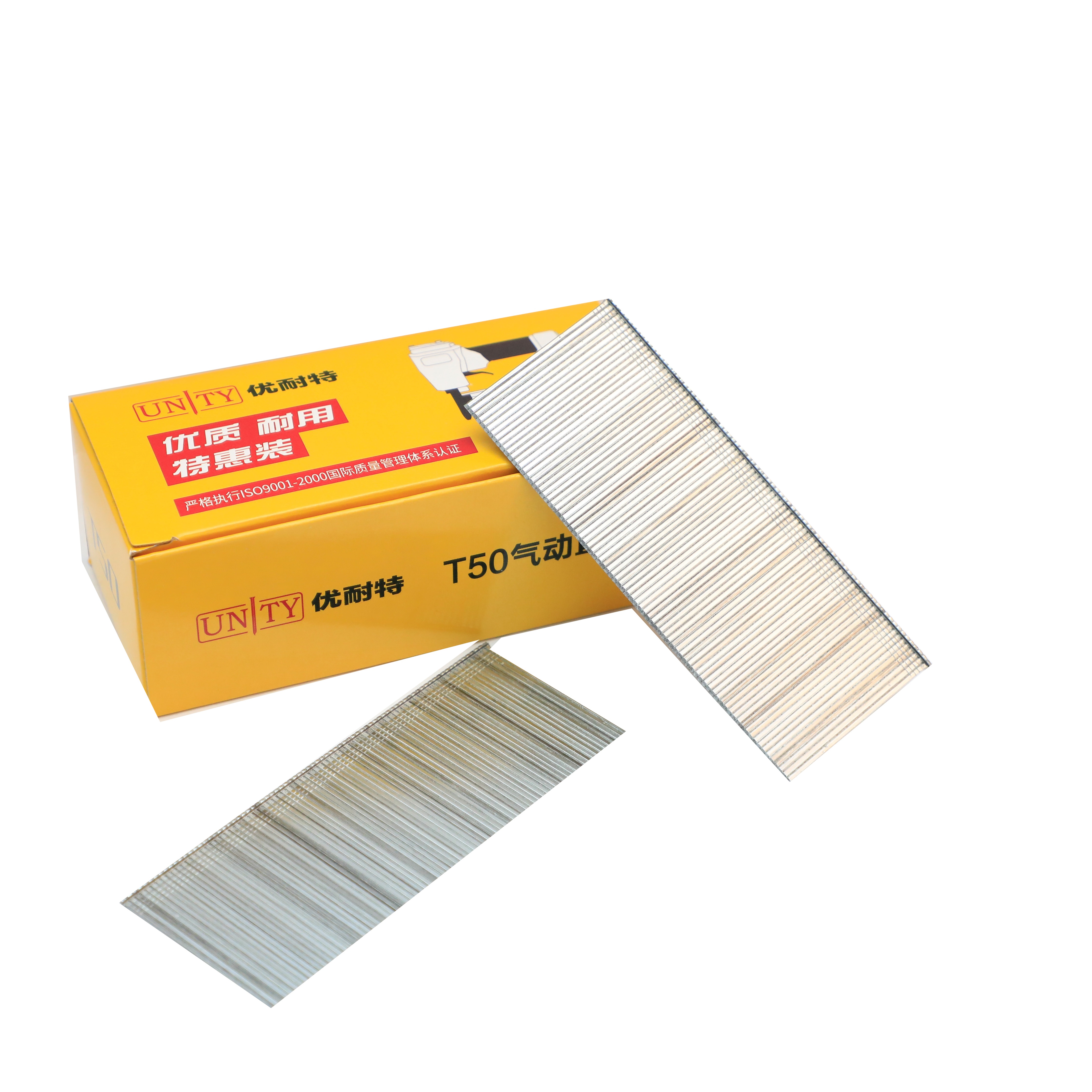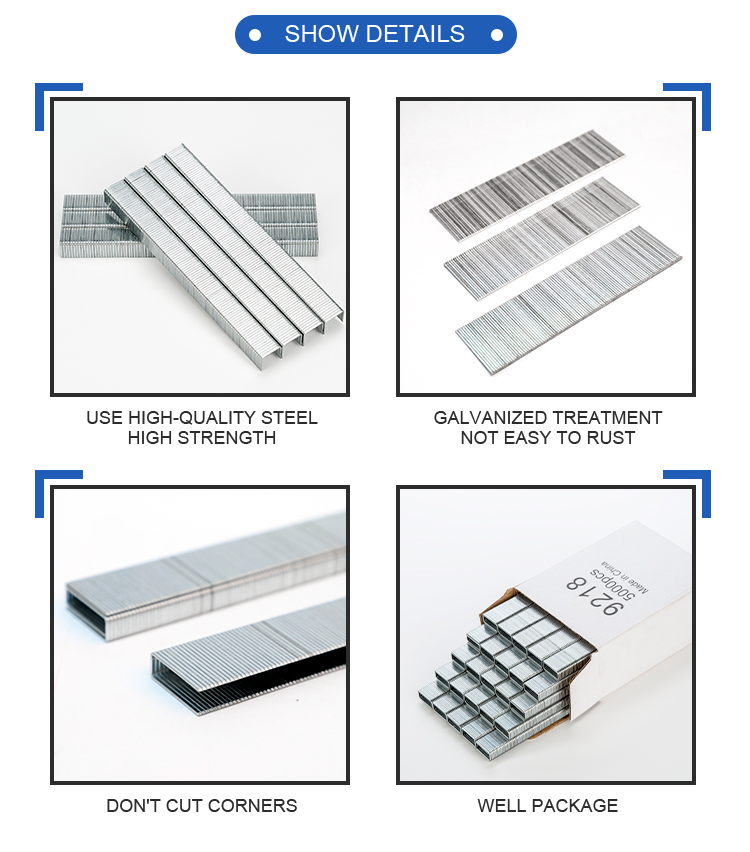 The main products are industrial staples (80, 90, 92, 100, 32, 35, 84, 97, 50, 71, 4J, 10J, 10F, 12F, K&N series, etc.), office staples (No. 10), 24, 26 series, etc.), square-head nails (T series, F series, No. 16 square-head nails, No. 18 square-head nails), coil nails and special fasteners (pigsty, corrugated fasteners, etc.), and nails Machines for making mechanical equipment such as staples, square-head nails, and single-wire staples (Hog rings, C-rings, etc.).