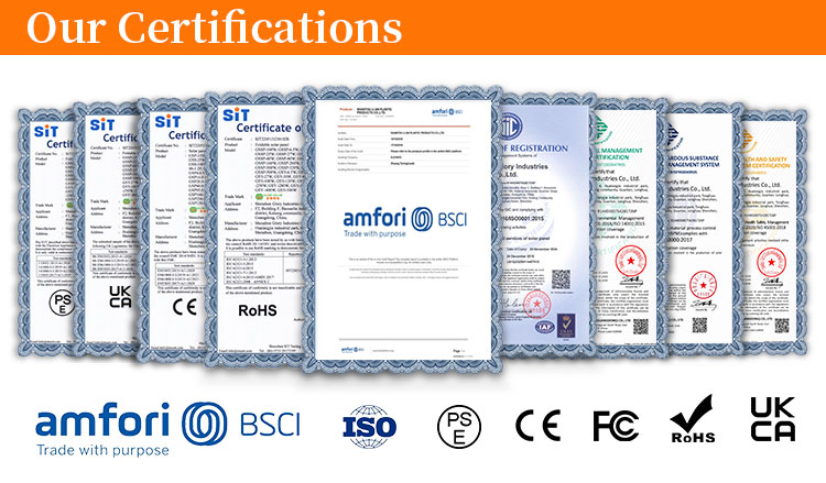 *We have obtainedBSCI,ISO9001, ISO14001, ISO45001, IEQC-QC080000, TUVagree. And Honor products have passed a number of strict tests, such asReach 223, SATand have obtainedCE, ROHS, FCC, PSE, UKCAcertification, which enables us to provide our customers with high quality solar products.