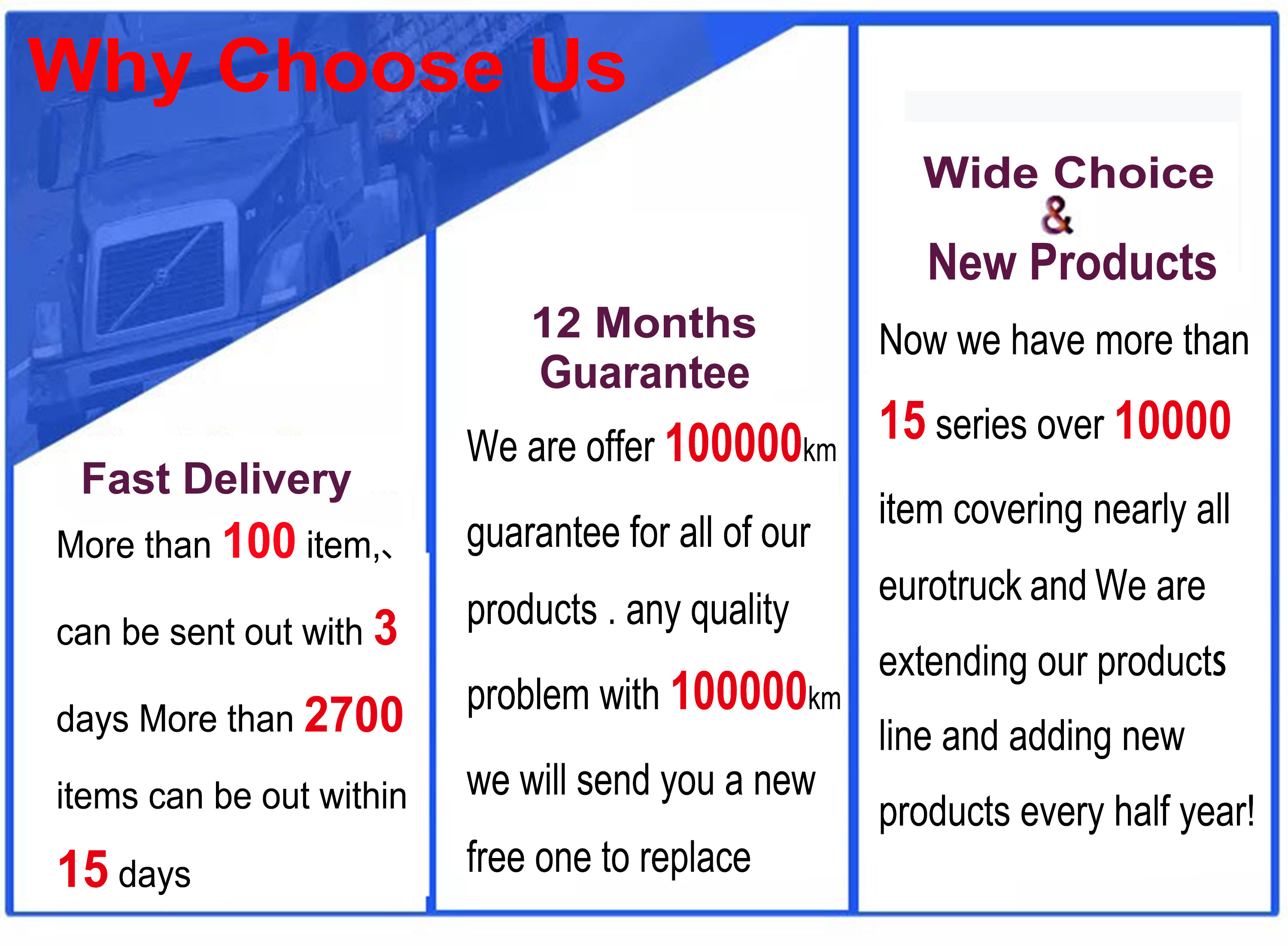 | Auto Parts: | Volvo, Renault, MAN, Mercedes-Benz, DAF, Scania, Iveco | Warranty: | 100,000 kilometers |