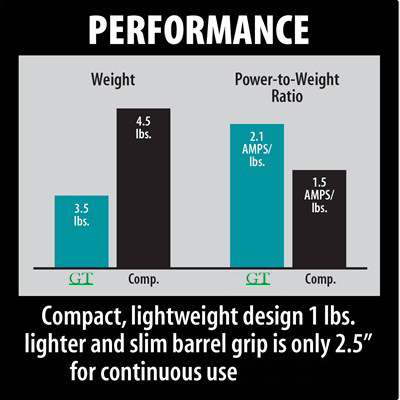 Easy-to-use features include oversized paddle switches for comfortable operation, and a lock/shutdown function for continuous operation. The 9557PB weighs only 4.5 lbs and has side handles that easily fit on either side of the tool.