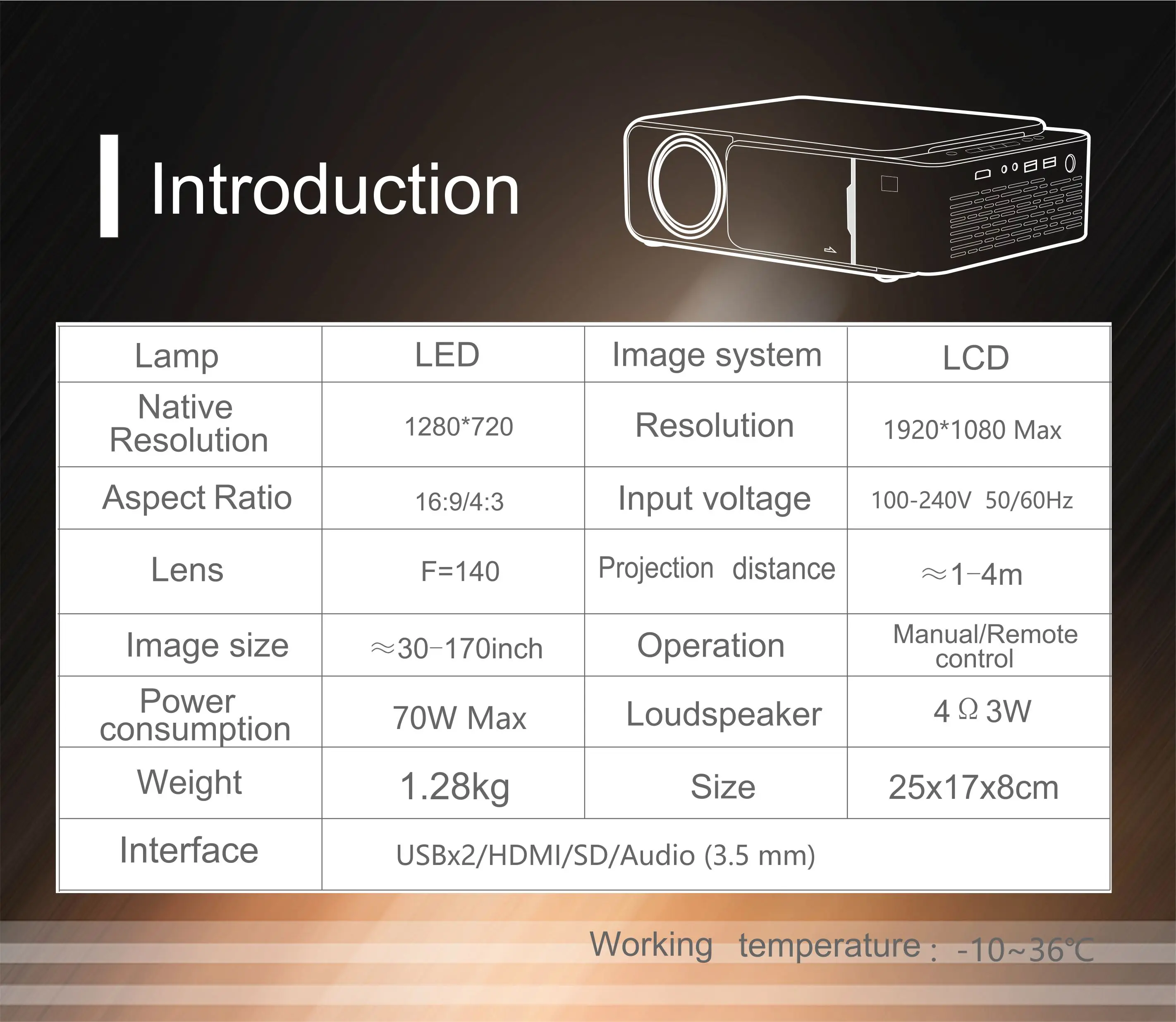 | Brightness: | 3500lms; | Projection Distance: | 1-4m; |