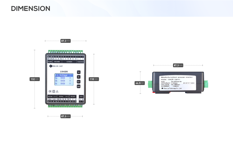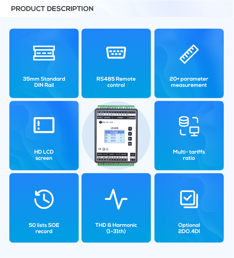 194DR multi-function energy meter is one of Bluebird three-phase energy meters. This multifunctional power meter is three-phase and suitable for DIN-rail mounting.