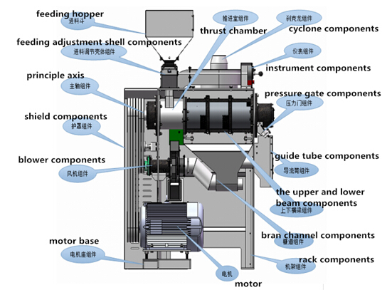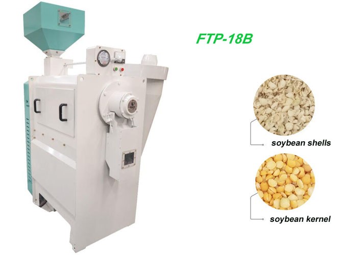 Send the soybeans to be dehulled into the hopper; the dehulling point is located between the dehulling stone and the hull. Due to the pressure exerted by the rotating shelling stone, the soybean kernels are separated from the seeds and collected at the bottom together with the shells. The shells or husks are separated from the kernels by means of a blower. Thus, the cleaned grains are collected at the bottom outlet.