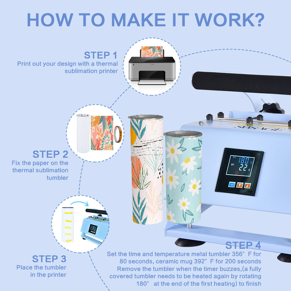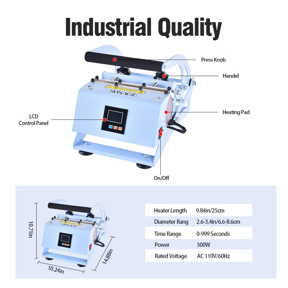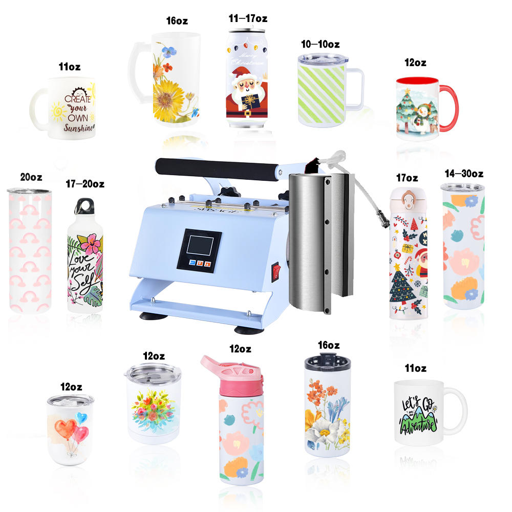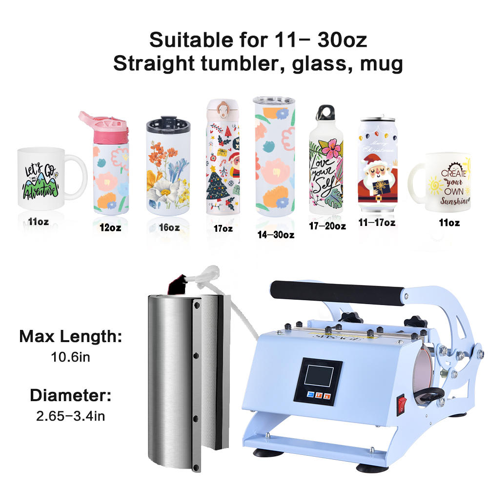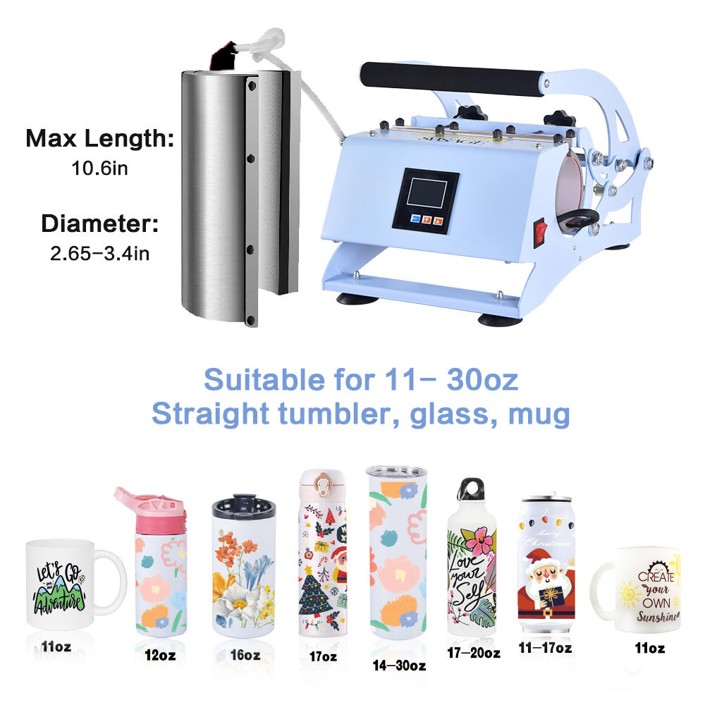easy to use | The roller press is easy to use and store, you can sublimation print 11oz or 15oz sublimation ceramic mugs 2pcs Various sizes of direct sublimation glass can be printed at one time. Diameter range from 2.83-3.43 inches |