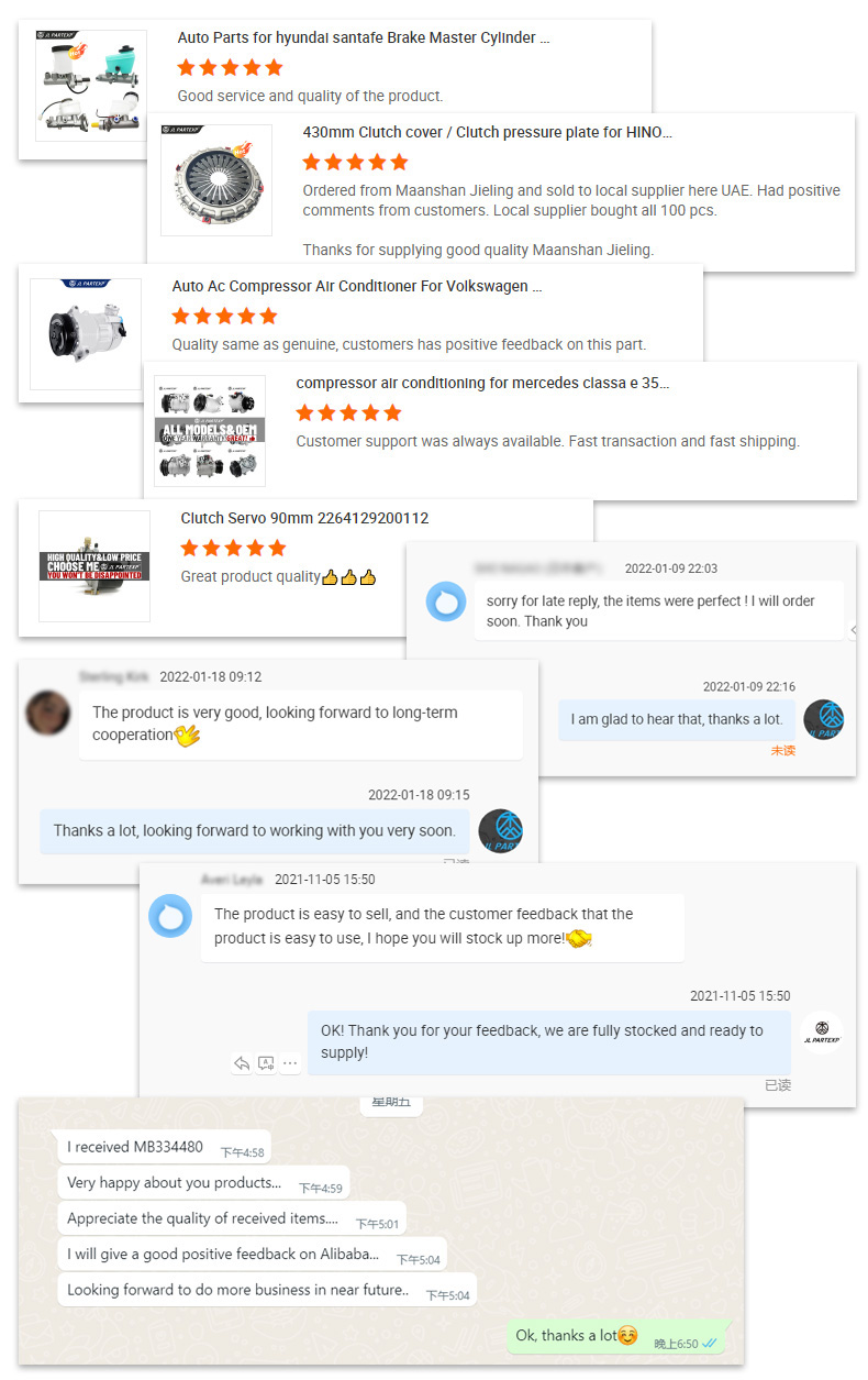 Q1: Are you a factory or a trading company? A: We are the trading branch of the factory, with an excellent trade team, we can provide you with high-quality trade services. The main products include clutch plates, clutch pressure plates, clutch boosters, brake master cylinders, brake calipers, brake air boosters and air conditioner compressors, etc. Q2: Can you produce according to samples? A: Yes, we can produce according to your samples or technical drawings. We can manufacture molds and fixtures. Q3: What is your sample policy? A: We can provide samples if we have ready parts in stock. However, customers have to pay the sample cost and the courier cost. Q4: Do you test all your goods before delivery? A: Yes, we have 100% test before delivery. Q5: How do you make our business long-term and good relationship? A: 1. We maintain good quality and competitive price to ensure our customers benefit; 2. We respect every customer, just like our friends, and we sincerely do business and make friends with them, No matter where they come from. Q6: What is your packing terms? A: Generally, our goods are packed in neutral white boxes and brown cartons. If you have a legally registered patent, we can pack the goods in your branded boxes after getting your authorization letters. Q7: What is your terms of delivery? A: EXW, FOB, CFR, CIF. Q8: What is your payment terms? A: T/T 30% as deposit, 70% before delivery. We will show you the photos of the products and packages before you pay the balance. Q9: How about your delivery time? A: Generally, it will take 3 to 5 days after receiving your advance payment if we have stock. If we don't have stock, it will take 20 to 30 days for production after receiving your advance payment. The specific delivery time depends on the items and quantity of your order.