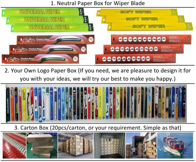 | Model: | C-Class, Civic, X4, A6, ESCORT, GRACE, A4, A8, Sonata, Commander, R8, EXCEL, X3, AMANTI, Global, Teana, SILVERADO, Octavia, TT | Packaging details: | 1 piece of wiper blade in color box, 20 pieces per box, |