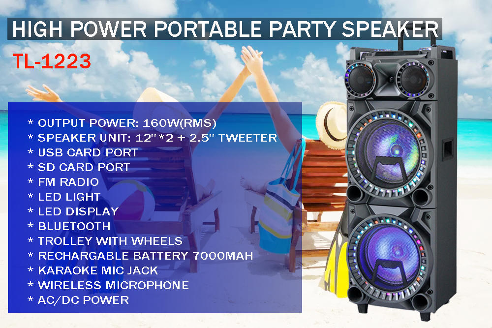 Output power: 160W Speaker unit: 12"*2 + 3"*2 Trolley speaker USB card reader/SD card reader/ Auxiliary input/FM radio/LED lighting/LED display Bluetooth/Karaoke Microphone Jack/TWS/DSP Power supply: AC power, DC power Product size: 435*390*1145mm carton Accessories: remote control, audio cable, AC 1 wired or wireless microphone USB/SD recording function TWS/DSP function | |
