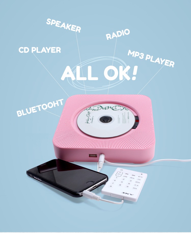 This CD is a multifunctional CD player that integrates BT, CD, FM, USB, and AUX; it supports CD, CDR, CD-RW, MP3-CD, and WMA-CD, and it is also a BT speaker.