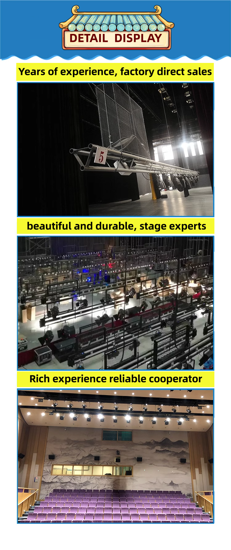 Features1. Stable structure, safe and reliable. 2. Integrate orbital rope winding technology to solve the problems of rope skipping and rope tangles. 3. Easy to install. 4. Suitable for large and medium-sized theaters, multi-functional halls, lecture halls, etc.