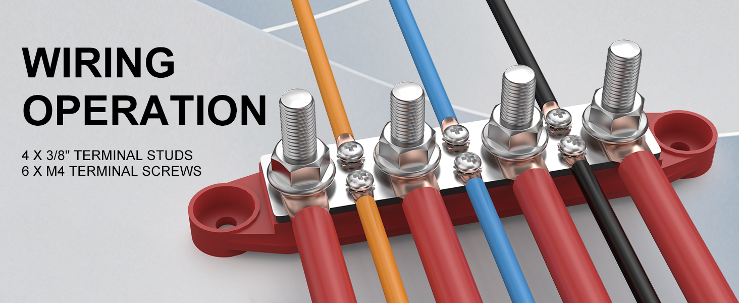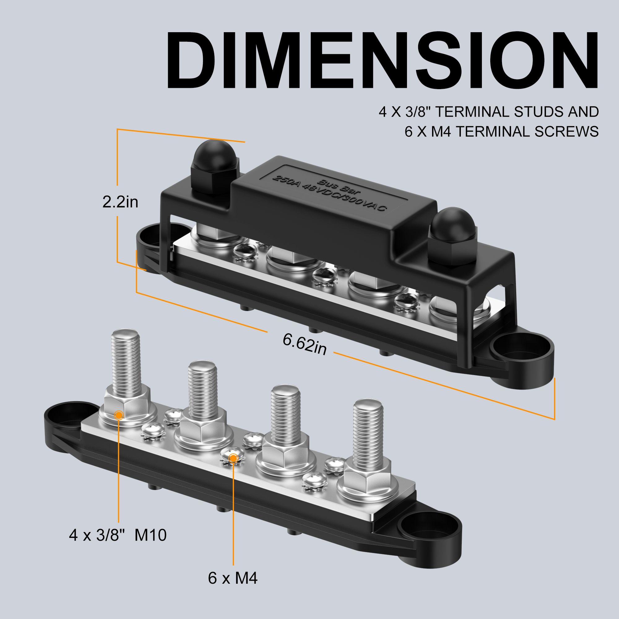 thing | BB250-T4M10S6-C High current 250A power distribution terminal block pure copper busbar 4 x M10 studs 6 x M4 #8 screws, suitable for automobiles |