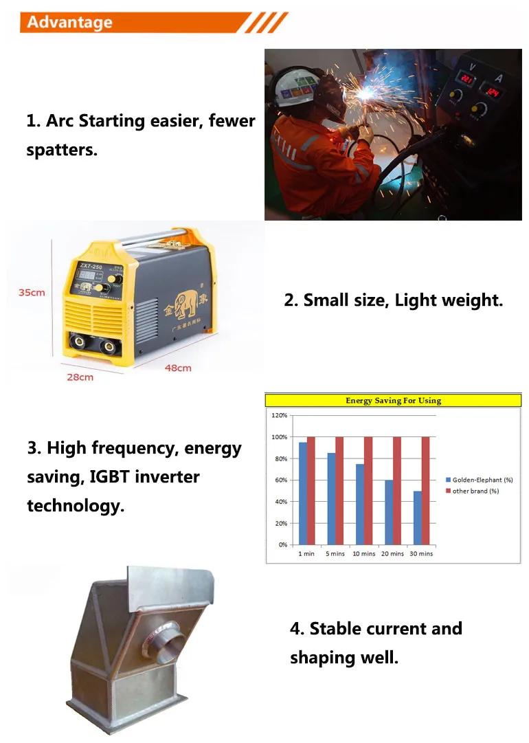 GOLEDEN ELEPHANT protable boxed electric welding machine is a new generation of inverter DC electric welding machine,using high-power IGBT tube.The control circuit of tihis series of electric welidng machines is designed as anti-jamming drive circuit,uses high-quality originals,has stable welding current and less splash.The portable box-packing design makes the electric welding machine suitable for small mobile opeation projects.It is widey used in shipyard,metallutgy,machinery manufaturing,pipe laying and other industries.