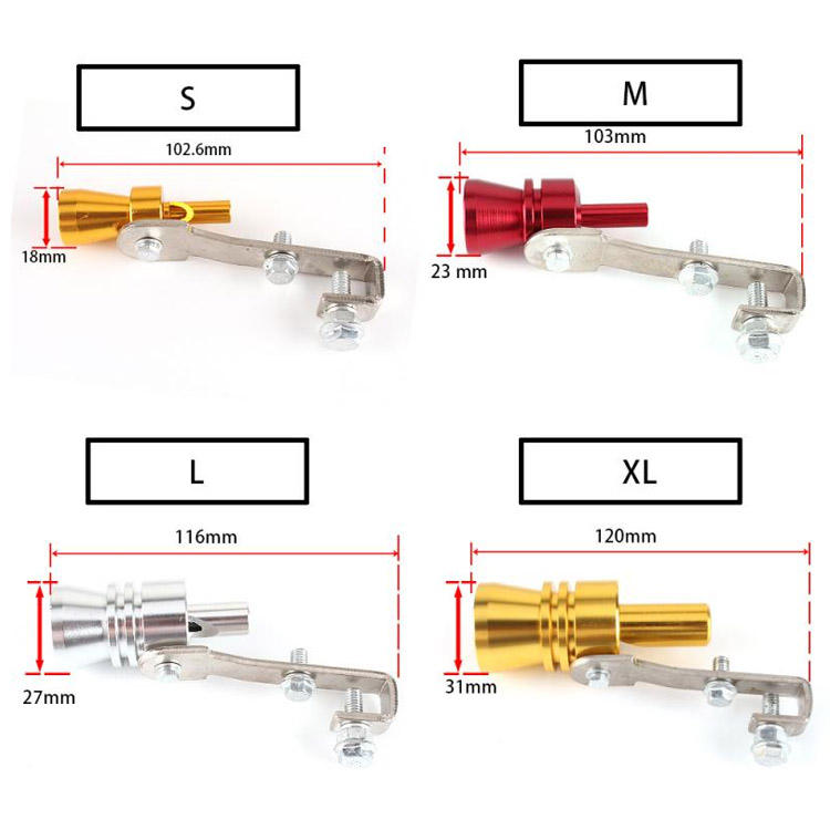 Specifications: S size is suitable for 1.0-1.6 displacement, exhaust pipe diameter 32-43 mm, M size is suitable for 1.6-2.0 displacement, exhaust pipe diameter 37-48 mm, X size is suitable for 2.0-2.4 displacement, exhaust pipe diameter 44 -55mm XL size is suitable for displacement 2.4 and above, exhaust pipe diameter 56-85mm. Installation: 1. Loosen the screws on the turbine whistle 2. Place the whistle body into the exhaust muffler, with the larger opening facing 3. Tighten the screw on the turbine whistle and tighten it so that it does not fall off while driving