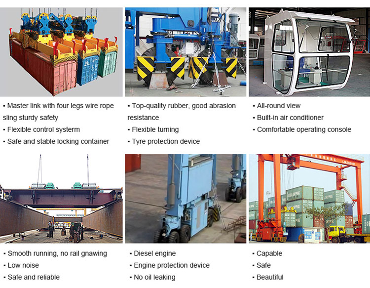 RTG tire crane consists of a mast, lifting trolley, crane operating mechanism, cab and electrical control system. The gantry is a box-shaped structure, the main beam is an inclined rail double main beam, and the outriggers are U-shaped. Contact us for more information