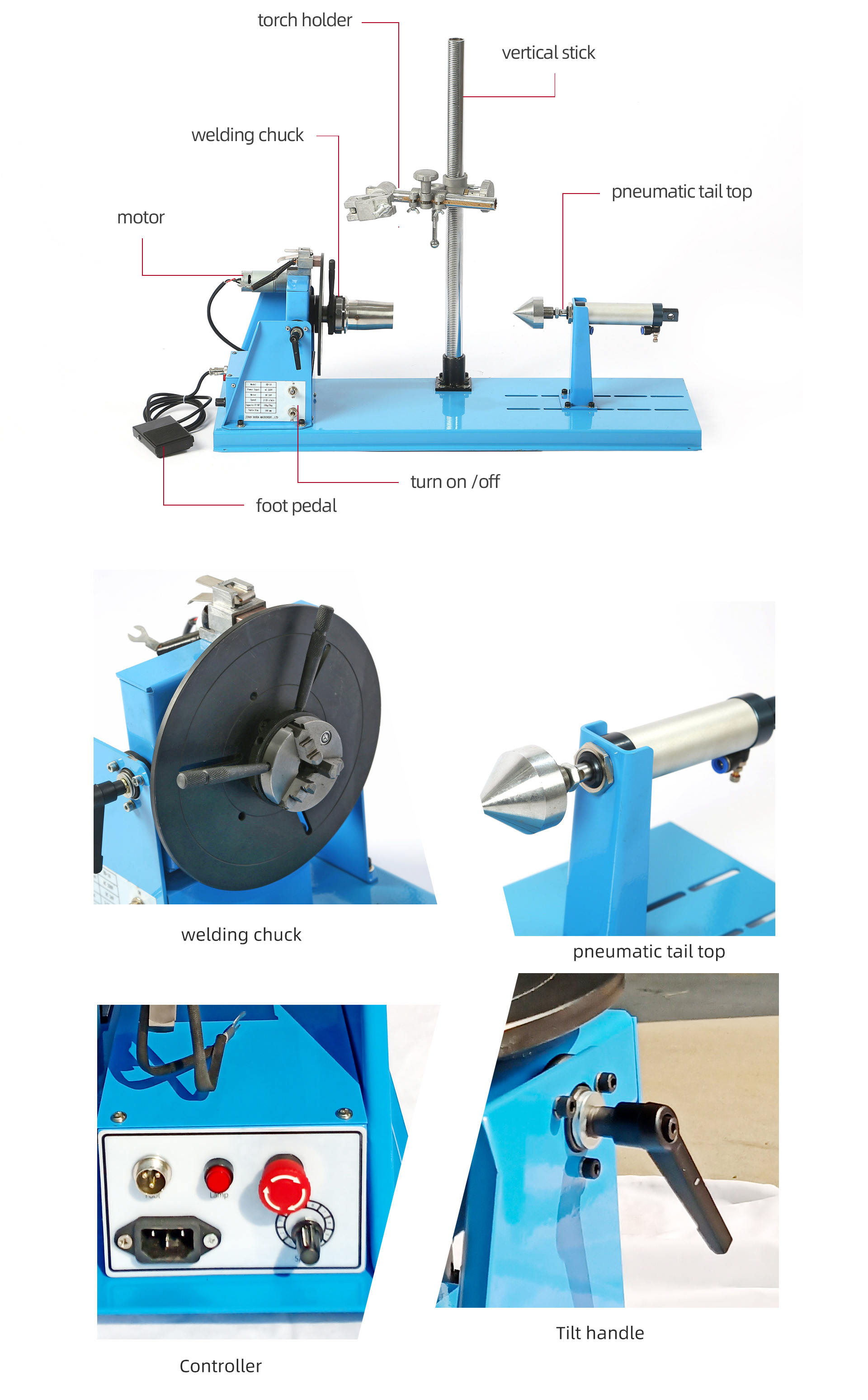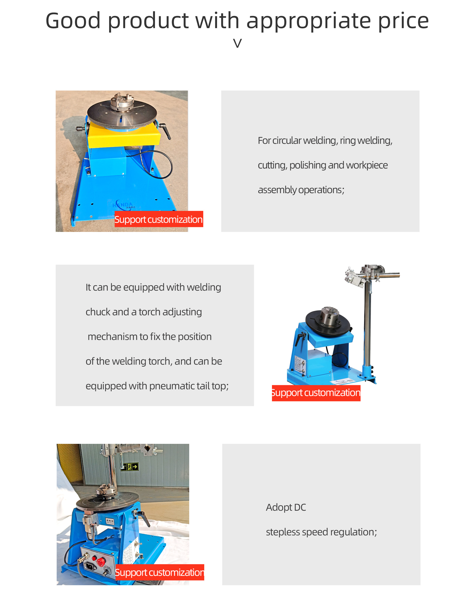 This welding positioner is a professional equipment for welding. Mainly used to rotate the workpiece and keep it in a horizontal or boat-shaped position for further welding. A chuck can be placed on its workbench or a clamping tool can be installed on the positioner to cooperate with manual welding work. The welding positioner can also be connected with an automatic welding machine to ensure the automation of the welding process.